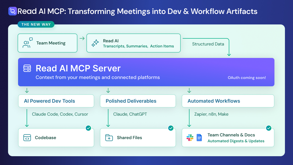 Le serveur MCP de Read AI est disponible dès maintenant, et la prise en charge d'OAuth sera bientôt disponible. Si vous utilisez déjà un outil compatible MCP tel que Claude Code ou Cursor, vous pouvez vous connecter en quelques minutes. Consultez notre documentation destinée aux développeurs pour configurer la connexion et commencer à transformer vos réunions en action.