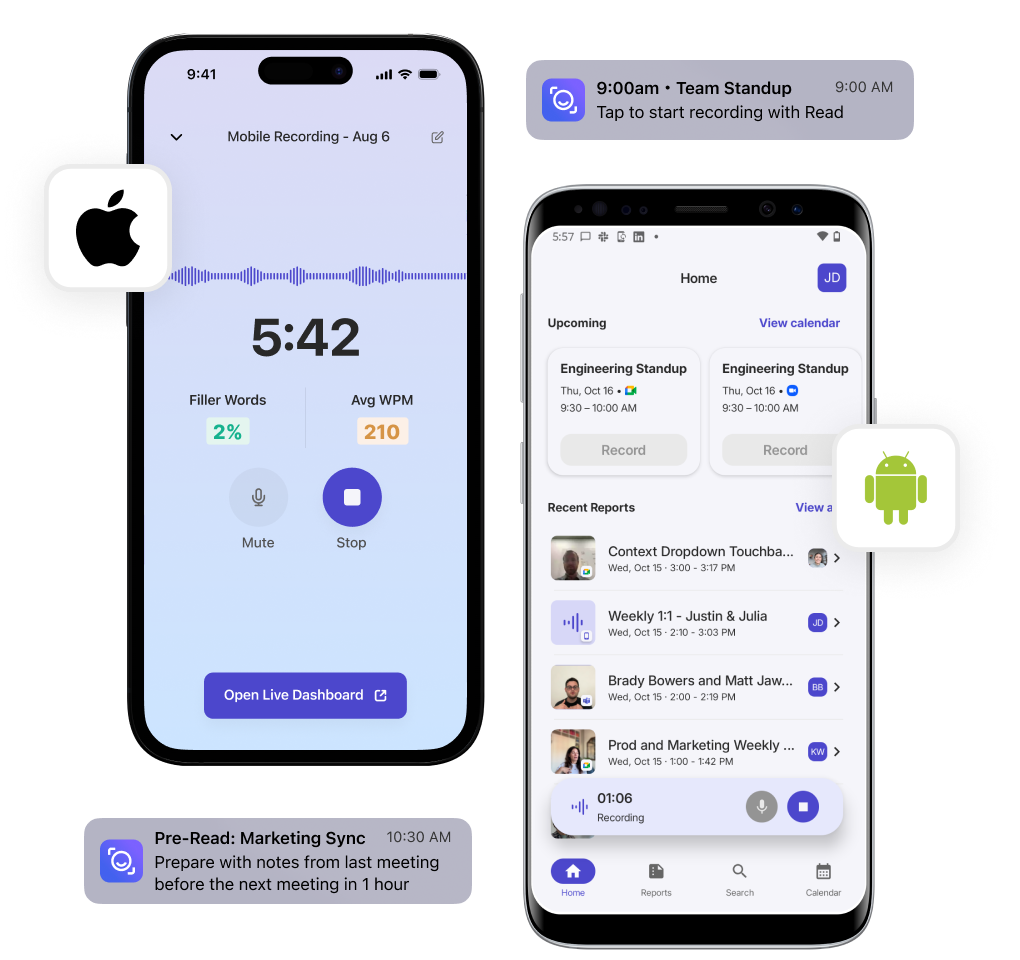 Over 50% of users use multiple video conferencing tools. Read is the only AI solution that seamlessly works across Zoom, Teams, Google Meet, and in-person meetings, delivering comprehensive insights so you're always prepared, no matter where you meet.