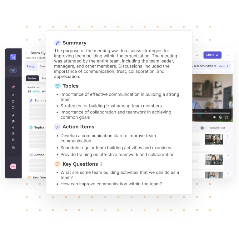 Using generative AI, Read creates a customized summary of your past 14 days and isolates key topics based on your engagement. With each topic, Read generates clips with video and transcript excerpts, action items, and key questions for an easy-to-access update.